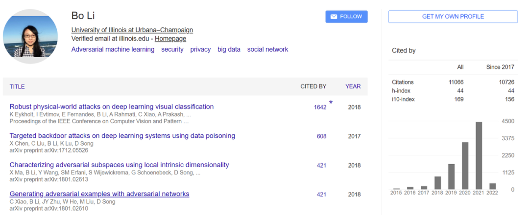 李博教授现任职于伊利诺伊大学厄巴纳-香槟分校计算机科学系。她曾荣获许多学术奖项,包括麻省理工学院技术评论 MIT TR-35 、Alfred P. Sloan 斯隆研究奖、NSF CAREER 奖,英特尔新星奖、赛门铁克研究实验室奖学金,并获得来自Amazon、Facebook、谷歌、英特尔和 IBM 等科技公司的学术研究奖。她的论文曾获多个顶级机器学习和安全会议的最佳论文奖;研究成果还被永久收藏于英国科技博物馆。