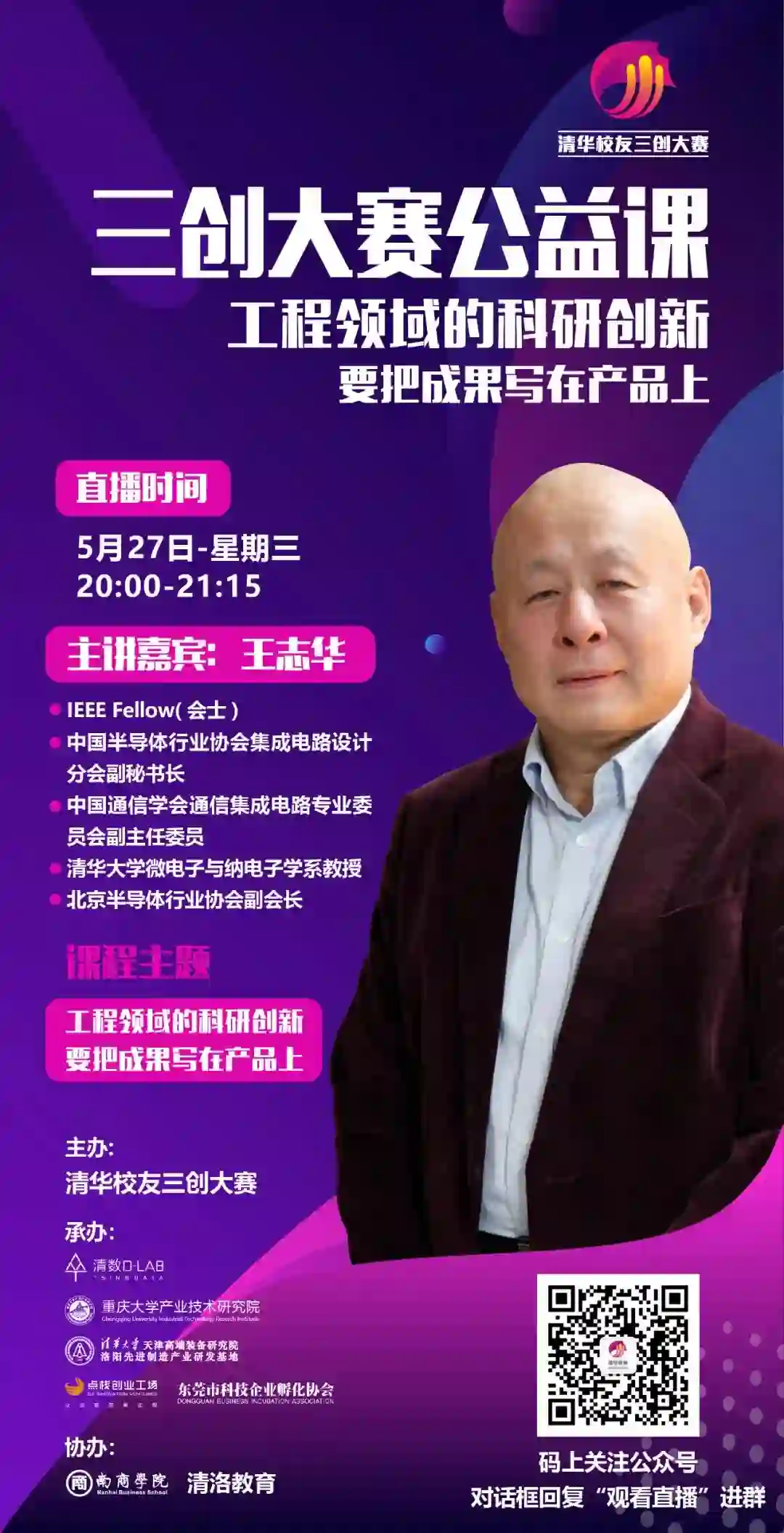 直播地址: 扫描下图二维码,关注公众号,对话框内输入“观看直播”,即可进入公益课直播群。
