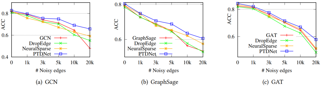 如图是几个常见数据集中的节点分类结果。之后测试这个模型是否能真的剔除噪音边,因此在Cora数据集中随机加入干扰边,可以发现随着随机边的增加,PTDNet模型改进的会更加明显: