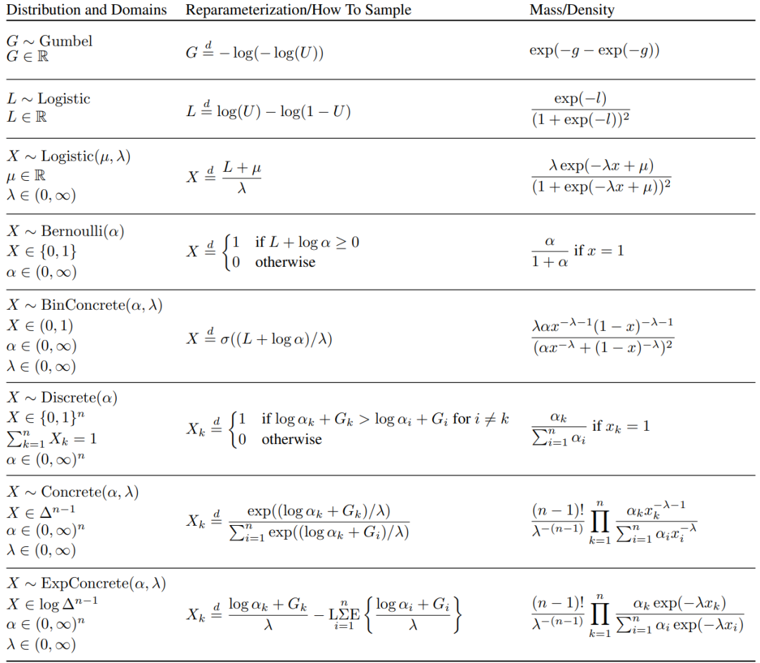 表示统计函数( cumulative distribution function, CDF),根据CDF可以得到对 的微分结果:(PS: 对于所有分布的重参数采样后的结果来源于SCG[1]中的,且作者是给了一个很大的表可以用作参考,L指Logistic 函数。)