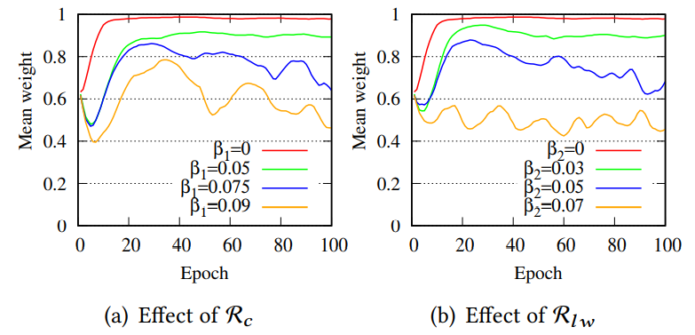 纵坐标表示占比,可以发现使用PTDNet之后的度分布曲线与原始分布比较接近,而DropEdge的形态改变比较明显(这个图有一点小typo,但是不影响阅读)。之后,可以看一下两个约束项对模型有多大影响:
