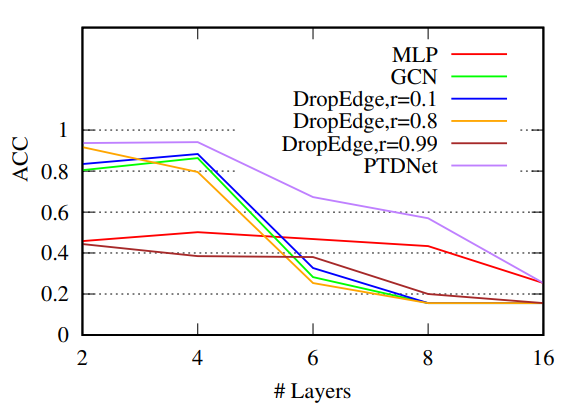 这里的Mean weight表示留下来的边占多大比例,可以发现这两种约束都可以有效滤除边的数目。PTFNet是可以延缓深度带来的over-smoothing影响的,实验如下: