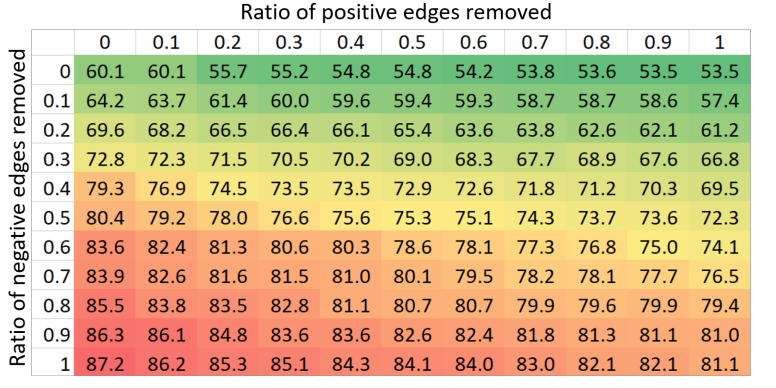 GNN 模型通常是根据拓扑结构,利用节点特征构建消息传递过程。然而,并不是所有的节点都需要参与消息传递过程,因此,需要一种选择的方法来刻画哪些边上的消息传递是真正需要的,也就是对边信息进行去噪。作者首先给出了一个GCN在Cora上的实验小例子,这个实验将相同标签的节点连接成正边,否则为负,对这些边进行随机移除,发现负边的移除会使得模型准确率上升: