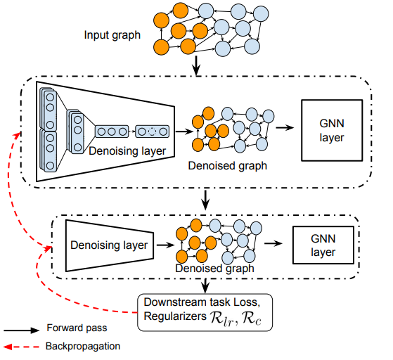 这种针对拓扑结构进行修改确实也有很多讨论,比如GAT中有对边进行重新权重,或者比如DropEdge对图进行采样构造小子图避免过拟合。然而这些方法大多基于随机方法,对于下游任务很难说明为什么这些采样的信息更有帮助,其次,节点信息和图的拓扑结构应该同时去考虑什么样的信息应该被过滤。因此,作者采用参数化方法表示图拓扑结构,并对其进行去噪。