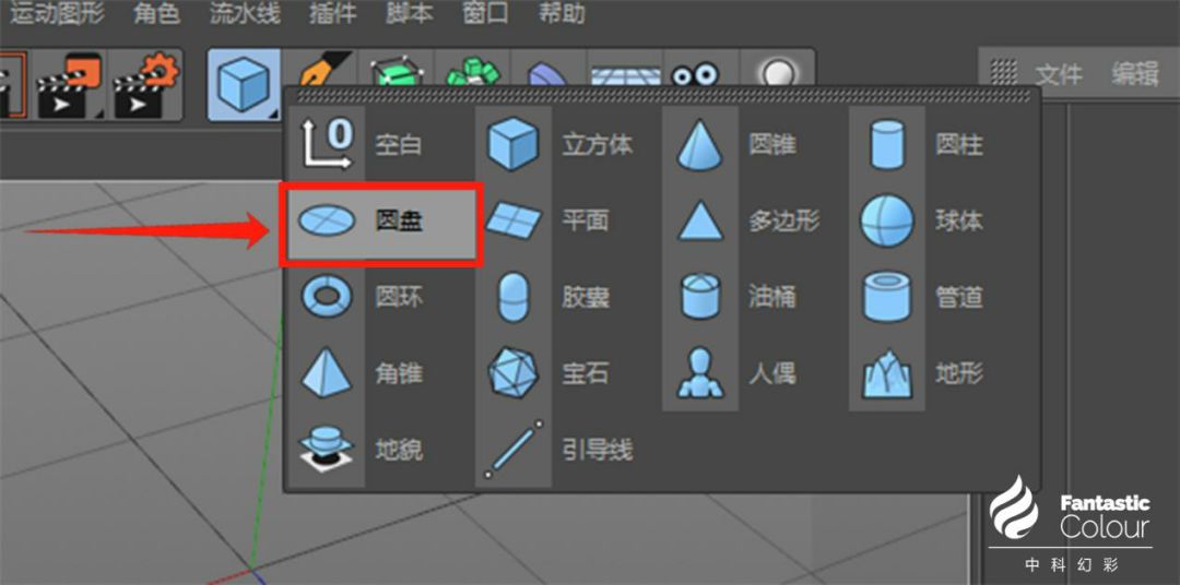 打开C4D添加对象:【圆盘】,找到下图物体图标,鼠标长按左键选择添加【圆盘】工具。如图1、图2所示: