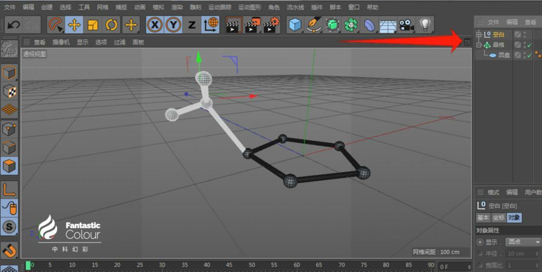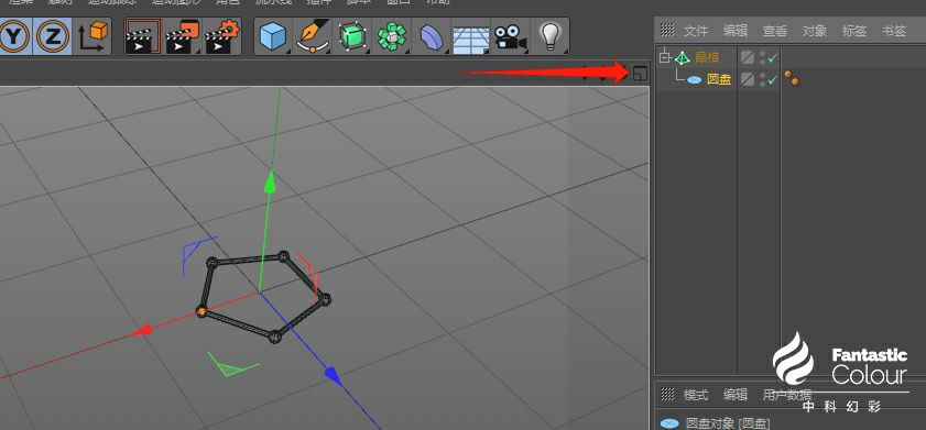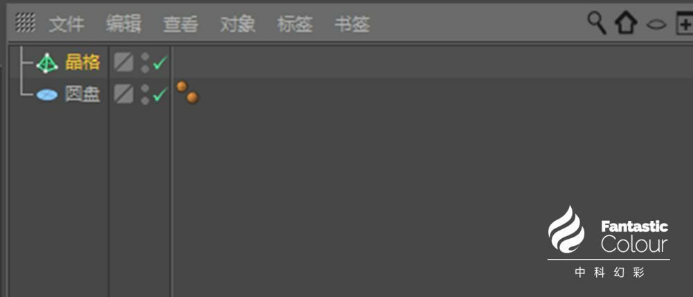 在【对象】窗口中,把【圆盘】按住鼠标左健,拖拽进【晶格】的子层级里直到出现向下的小箭头松开即可。如图8所示: