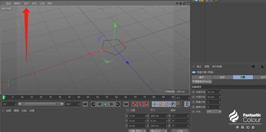 在【对象】窗口中选中【圆盘】在【属性】窗口中设置,将圆盘分段设置为1,旋转分段设置为5内部半径跟外部半径大小都设置为50cm,并在【显示】中选择【光影着色(线条)】。如图3、图4、图5所示: