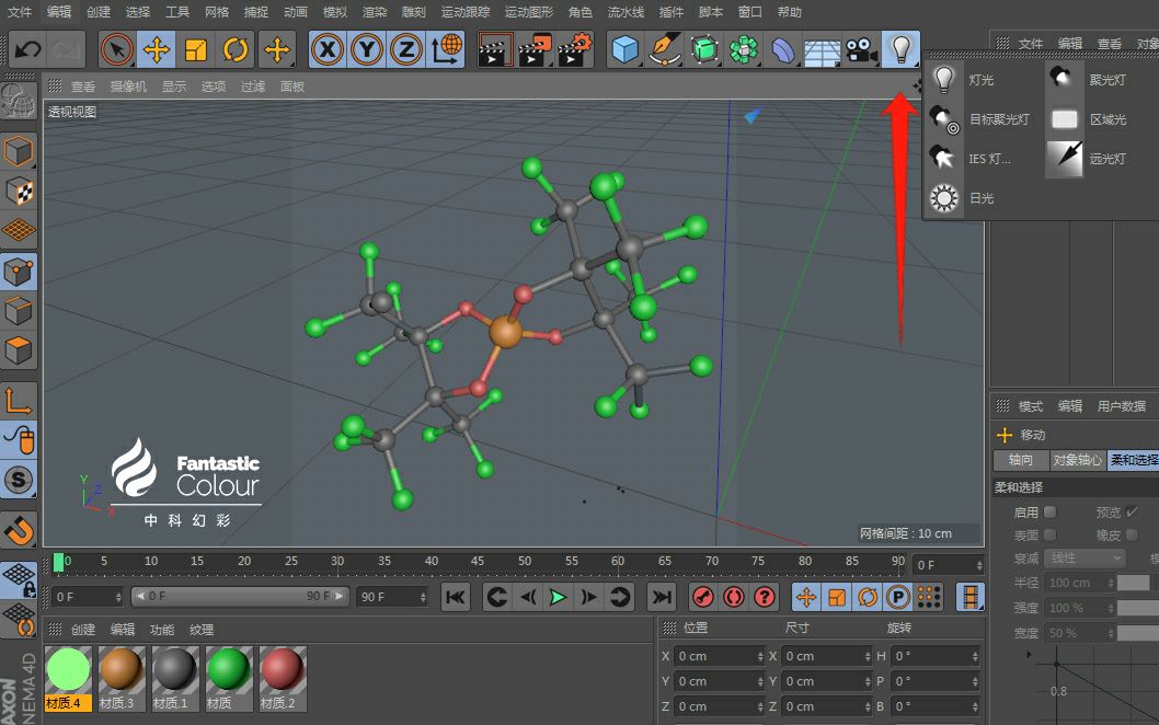 添加【灯光】,鼠标点击上面工具栏最右边的灯泡图标,选择自己想要添加的灯光方式单击进行灯光添加,通过上下拖动查看灯光效果,(通过键盘按键Ctrt+R)进行渲染浏览查看。如图26、图27所示: