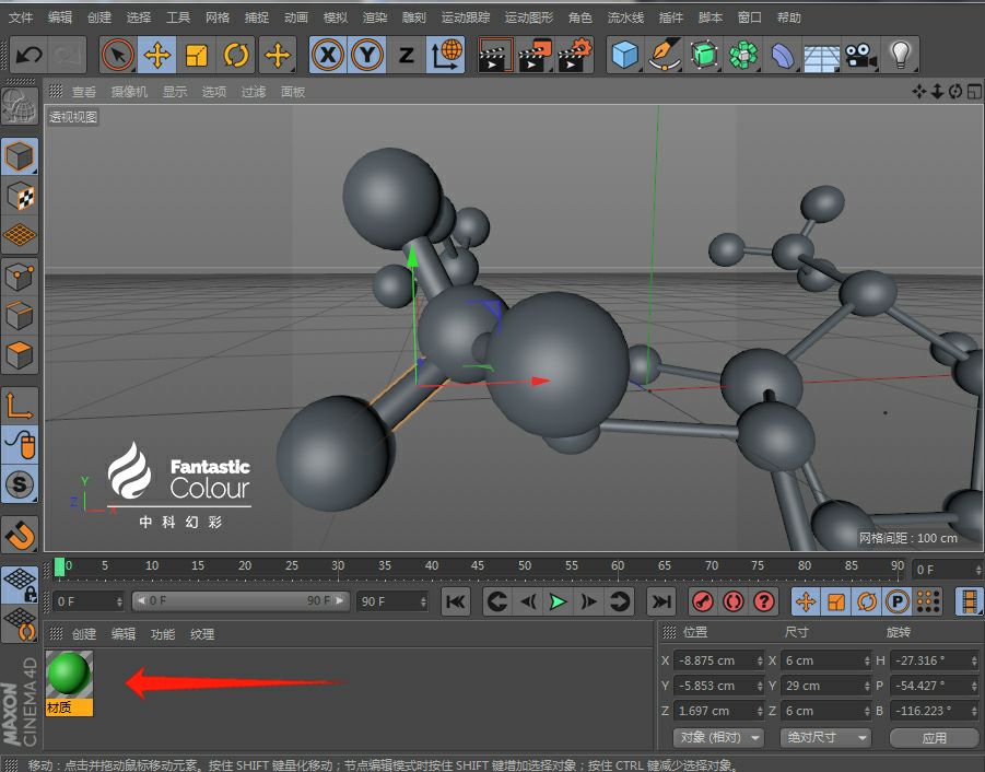 建立一个半径为2cm高度为58cm的【圆柱】 然后再建立出一个跟半径为5cm的【球体】通过调整方向跟角度对齐到球体上。(调整方向键盘键是R,调整上下键为E)。如图12、图13所示: