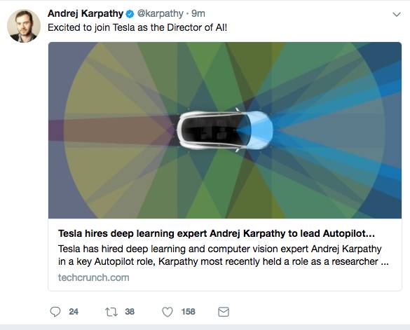【新智元导读】 Techcrunch21日报道,特斯拉刚刚聘用了深度学习和计算机视觉专家 Andrej Karpathy ,担任人工智能部门主管,在 Autopilot 中扮演重要角色。Andrej毕业于斯坦福人工智能实验室,博士师从李飞飞教授。Open AI 失去 Ian Goodfellow后,又损失一名大将。