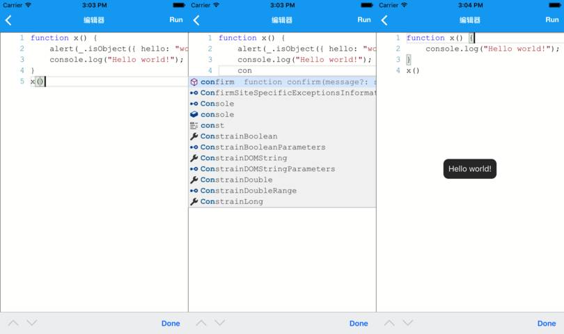 而显然它不仅仅是一个编辑器,它还可以运行 JavaScript 代码,一个『伟大的手机 IDE』就此诞生了。输入完代码,点击运行,即可运行代码。console.log 会以 Toast 的形式展示出来。
