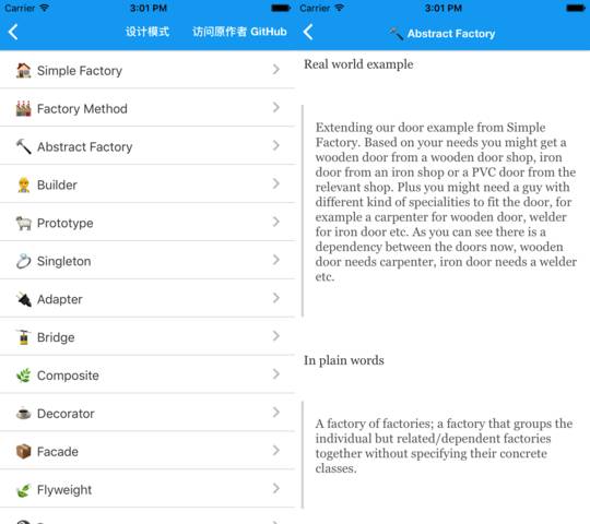 既然我们都已经有算法和数据结构、正则表达式,我便将 GitHub 上的 Design Patterns for Humans 也集成了到 APP 里。