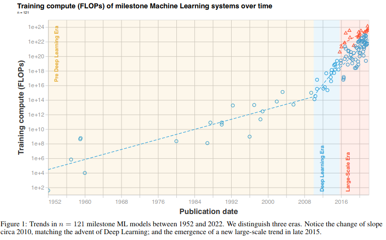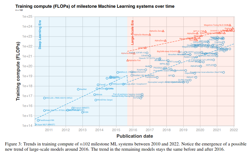 总而言之,在前深度学习时代,计算进展缓慢,随着 2010 年进入深度学习时代,这种趋势加速了。在 2015 年底,企业开始生产优于趋势的大规模模型,如 AlphaGo,标志着大规模时代的开始。然而,这并不能确定区分大规模和常规规模的模型而形成模式。