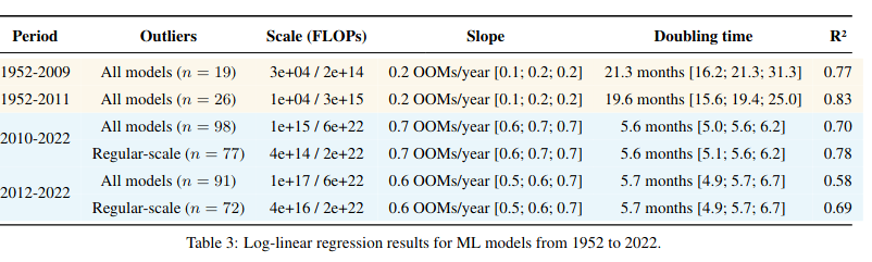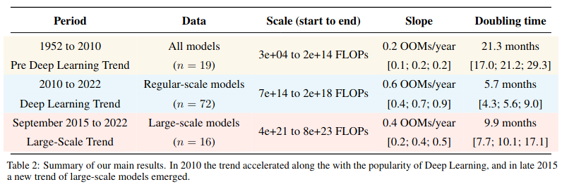 这一发现与 Amodei & Hernandez (2018) 和 Lyzhov (2021) 形成对比,前者发现 2012 年至 2018 年的倍增期为 3.4 个月,后者发现 2018 年至 2020 年的倍增期超过 2 年。以前的评估无法区分这两个独立的模式,因为大规模的趋势是最近才发展起来的。