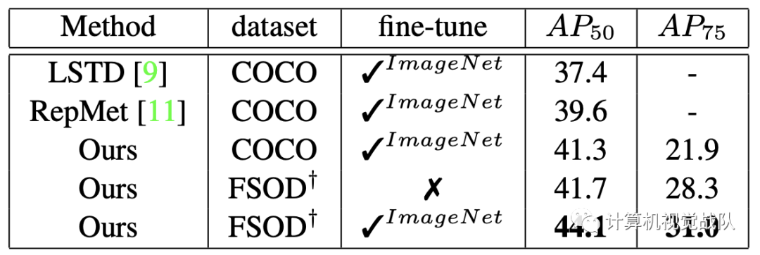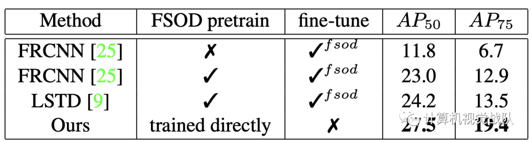 上表进一步比较了在不同训练策略下具有注意力RPN的模型和具有常规RPN的模型。在AP50和AP75评估中,注意力RPN的模型始终表现出比常规RPN更好的性能。在AP50 / AP75评估中,注意力RPN在1-way 1-shot训练策略中产生0.9%/ 2.0%的收益,在2-way 5-shot训练策略中产生2.0%/ 2.1%的收益。这些结果证实,我们注意力的RPN会产生更好的建议并有益于最终的检测预测。因此,在我们的完整模型中采用了注意力RPN。