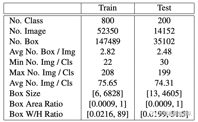 数据集是专为几次学习和评估新颖类别模型的通用性而设计的,该模型包含1000个类别,分别用于训练和测试集的800/200分割,总共约66,000张图像和182,000个边界框。下表和下图显示了详细的统计信息。我们的数据集具有以下属性。