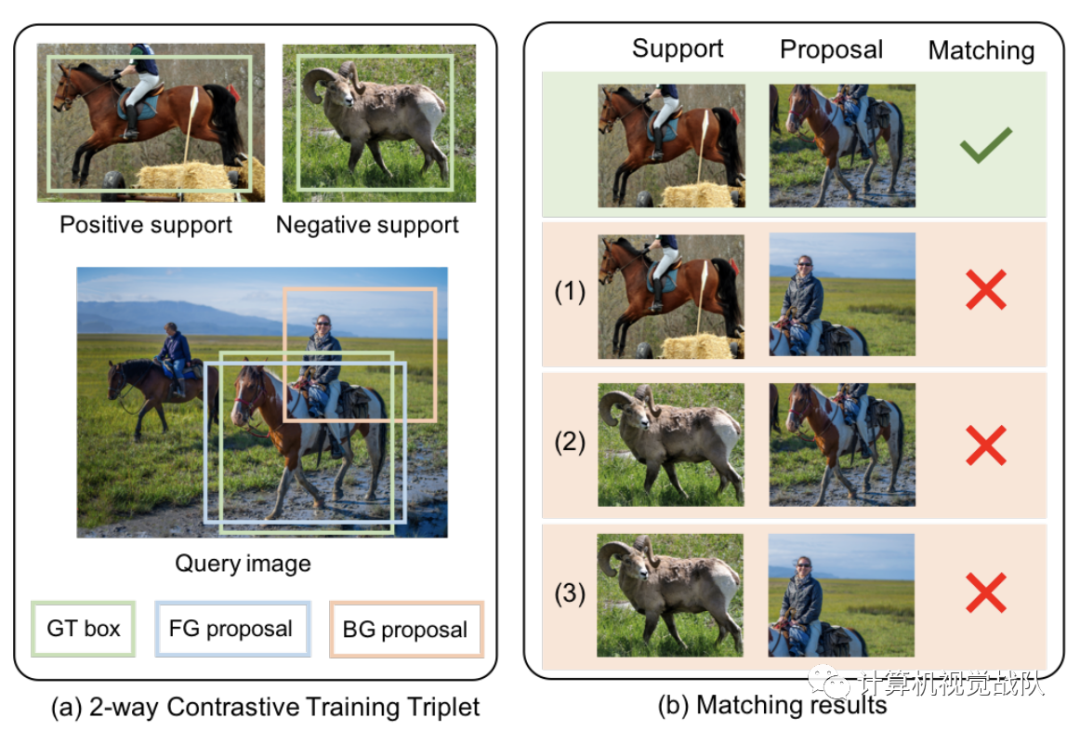 2次对比训练三联体和不同的匹配结果。在查询图像中,只有正支持与目标基本事实具有相同的类别。匹配对包括正面支持和前景建议,非匹配对具有三类:(1)正面支持和背景建议;(2)负面支持和前景建议;(3)负面支持和负面建议。选择训练策略: