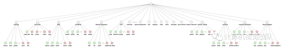 包含了83中父类语义,例如哺乳动物,衣服,武器等,这些语义进一步细分为1000个叶子类别。我们的标签树如上图所示。由于严格的数据集划分,我们的训练/测试集包含了非常不同的语义类别的图像,因此给要评估的模型带来了挑战。