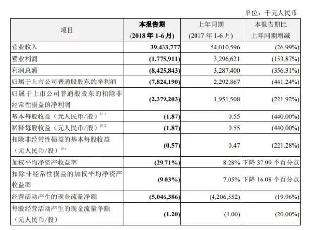 2018年1-6月中兴通讯归属于上市公司普通股股东的净利润为-78.24亿元人民币,同比减少441.24%,基本每股收益为-1.87元人民币,主要由于支付了对美国10亿美元罚款,及2018年5月9日发布的《关于重大事项进展公告》所述本公司主要经营活动无法进行导致的经营损失、预提损失所致。