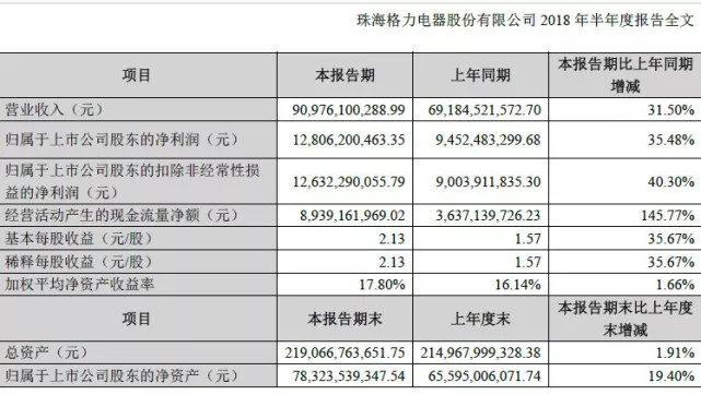 昨日,格力电器发布半年报,营业收入909.8亿元,同比增长31.5%;净利润128亿元,同比增长35.48%。