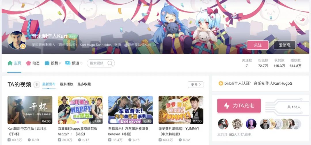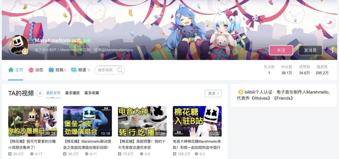 虽然入驻时间不长,但 Marshemello 在 B 站上的粉丝数也已经达到 39 万。如果你错过了他之前在游戏《堡垒之夜》里开的线上演唱会,也可以在他的 B 站投稿中回顾。对了,同为电子音乐制作人的 Alan Walker 也有自己的 B 站账号,作为电音爱好者的你,怎么能错过这两个大神级的制作人。