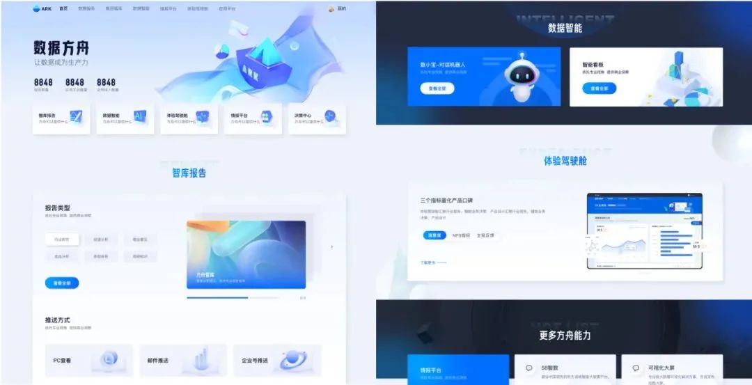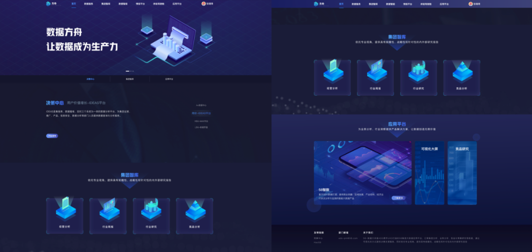 以近期工作中的数据方舟项目的首页改版为例:方舟作为各业务线决策中心的统一分发入口,提供了集团顶层数据知识及应用;并且横向接入数据工具、集团智库、数据应用功能,纵向挖掘数据价值、搭建看板平台。为了能够更好的强化品牌认知,打造更加智能的体验,我们进行了这次的品牌升级。