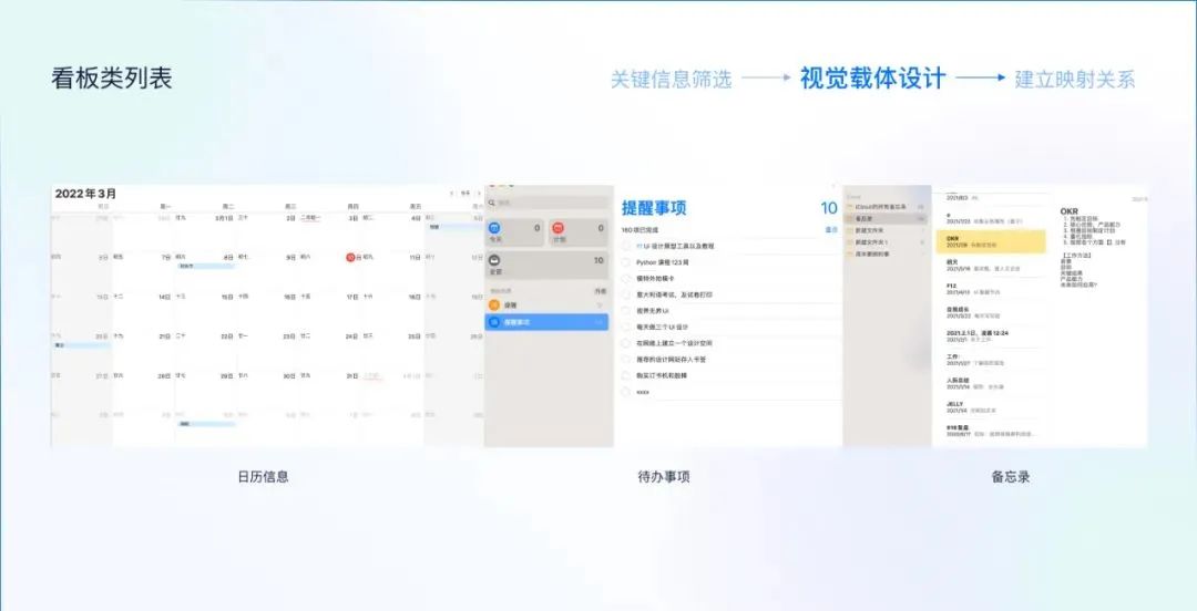 其次选择视觉载体进行,首先根据看板的功能提炼出关键词,如:查看、时间、状态。围绕关键词寻找符合寓意的载体参考,比如日历、日程表等。