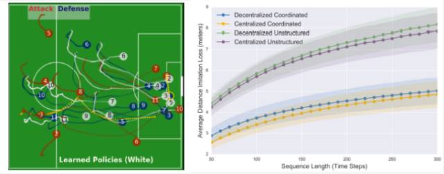 本文由加州理工大学、迪斯尼研究院和STATS公司(该公司有大量体育比赛的各类实际数据)联合发表,通过模仿学习方式学出多智能体控制模型。本文收集了大量英超足球比赛数据,使用结构学习方式自动学出智能体和实际数据的合理对应关系。这里的对应关系是指,比如当前智能体在某个具体位置到底是更适合学习前锋、前卫还是中场的行为。