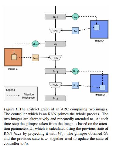 本文由北卡罗来纳大学和印度科学研究院共同完成。Attentive Recurrent Comparator (ARC) 可学习一个近似的动态表示空间用于极小样本学习。在极小样本学习公开数据集合Omniglot上,错误率降低为1.5%,可以说是在这个人物的公开测评库上,AI超过了人类的识别水平。这个工作主要模拟人类比较两个图像相似度的行为,用一个RNN网络协调整个过程,采用相应注意力模型让两幅图像交替比对。在每一个Time Step,结合图像局部区域信息和RNN的前一个时刻状态,产生当前时刻状态。RNN的最终状态可推导出两副图像的相关性表示(Relative Representation)。