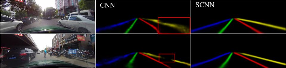 左上角图片中右边的车和左下角图片中右边的摩托车遮挡了右边的车道标记,对 CNN 的结果产生了负面影响。