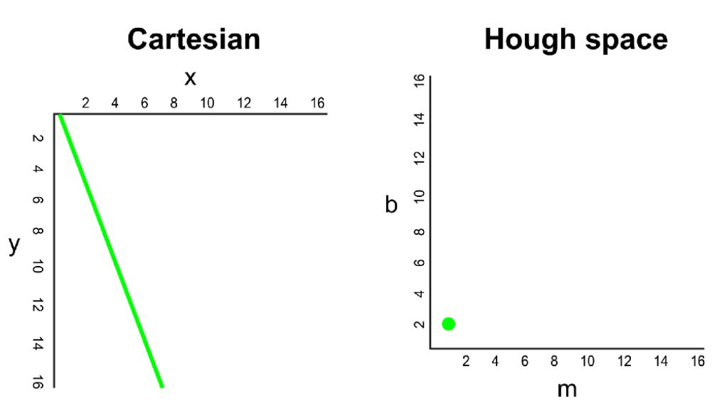 在笛卡尔坐标系中,我们可以通过绘制 y 对 x 的图像来表示 y=mx+b。但在霍夫空间中,我们也可以通过绘制 b 对 m 的图像将这条线表示为一个点。例如,直线方程 y=2x+1 在霍夫空间中可能是用 (2, 1) 表示的。