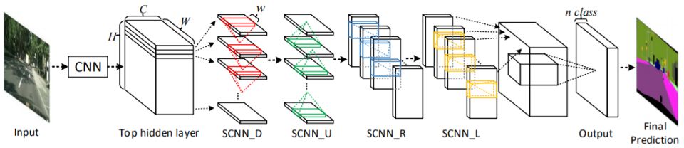为了解决这个问题,空间 CNN(SCNN)给出了一个架构,这个架构可以「将经典的深度逐层卷积在特征映射下推广到逐片(slice-by-slice)卷积」。这是什么意思?在经典的层到层的 CNN 中,每一个卷积层都从前面的一层接收输入,应用卷积和非线性激活后,将输出传递给后面的层。SCNN 将各个特征映射行和列视为「层」,进一步应用这一步骤,按顺序进行相同的过程(这里的按顺序指的是只有当这一片从前面的一片中接收到信息才会将信息传递给后面一片),这个过程允许像素信息在同一层的不同神经元之间传递,可以有效增强空间信息。