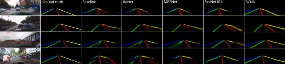 SCNN 是相对较新的、2018 年早些时候才发布的方法,但已经超越了像 ReNet(RNN)、MRFNet(MRF+CNN)这样更深的 ResNet 架构,以 96.53% 的准确率赢得了 TuSimple 基准车道检测挑战赛的冠军。