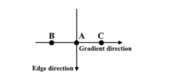 A 在垂直方向的边上。由于梯度方向垂直于边的方向,比较 A 的像素值和 B、C 的像素值来确定 A 是否是局部最大值。如果 A 是局部最大值,则在下一个点上测试非极大值抑制,否则将 A 的像素值设置为 0 并抑制 A。
