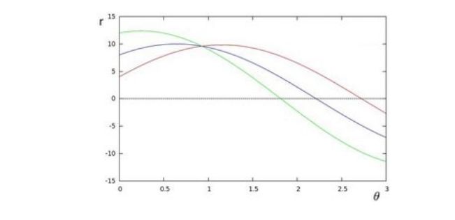 例如,对极坐标系中的点 (8, 6)、(4, 9) 和 (12, 3),我们在霍夫空间中绘制出的相应图像如下: