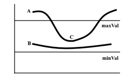 A 边高于 maxVal,所以是边。B 边在 maxVal 和 minVal 之间但没有和任何高于 maxVal 的边相连,所以删除。C 边在 maxVal 和 minVal 之间,且与 A 边(高于 maxVal)相连,所以是边。