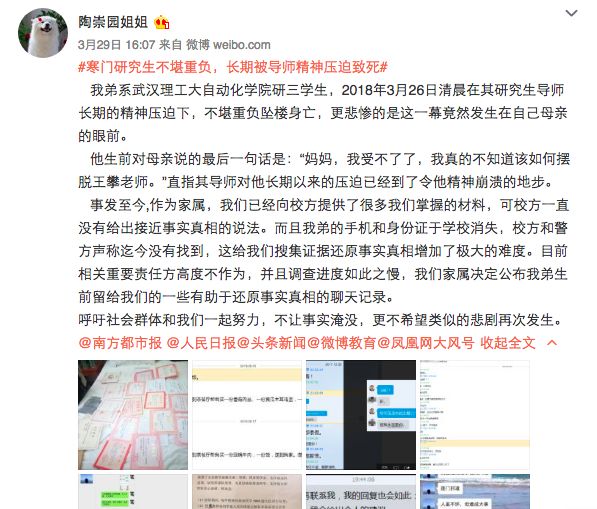 武汉理工大自动化学院研三学生陶崇园跳楼自杀——牵动了无数研究生和导师群体,特别是自动化和人工智能相关技术领域的人。无论事情的真相如何?我相信陶崇园事件不是个例,只是浮出水面的极端表现,还有更多的研究生正在被导师进行经济上压榨,体力上剥削,精神上的虐待!希望每一位善良的读者,老师,学生和家长都一起呼吁——帮助那些还在被“虐待和压迫”的学生!——导师(老板),请让我活着毕业!