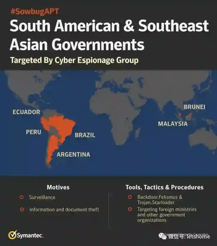 宅客频道消息,赛门铁克最近发现了一个此前不为人所知的网络间谍组织——名叫“Sowbug(潮虫)”。该组织一直在对南美和东南亚企业进行高度针对性的网络攻击,其中涉及到一些外交政策政府部门和外交组织机构。