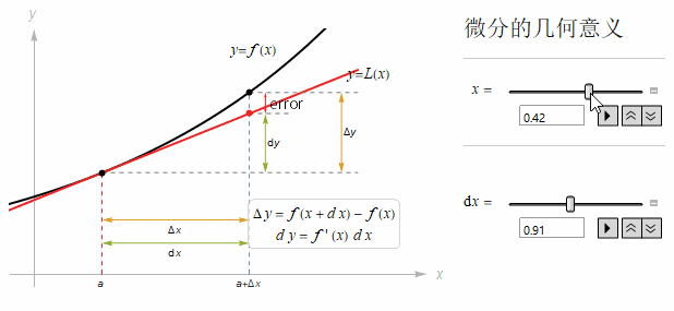 量df 被称为 f 在 x=a 处的微分, 它是当 x 从 a 变化为 a+△x 时 f 的变化量的近似. 这意味着 x 的微小变化会引起 y 的变化, 而后者的变化量约为前者的 f'(x) 倍.