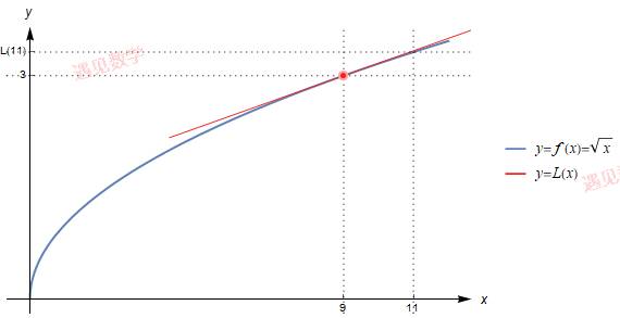 观察图形可以看到在 x=9 附近 L(x)非常接近于曲线 y=f(x) , 这意味着切线 L(11) 是对 f(11)=√11
