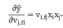 在FFM中,每一维特征 x_i,针对每一种field( fj)的特征,都会学习一个隐向量 v_{i,fj}。因此,隐向量不仅与特征相关,也与field相关。与FM模型类似,FFM模型方程定义为(为了计算简便只有交叉项):