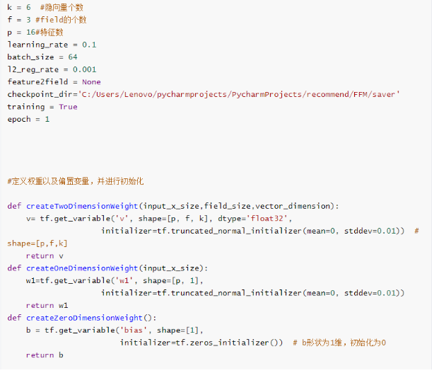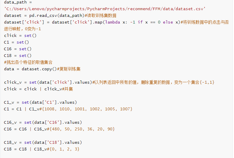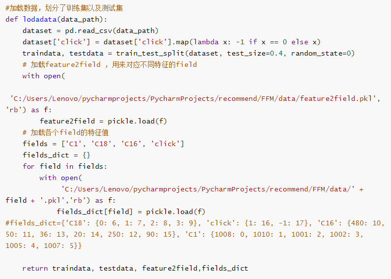 根据每一个特征所属的field,构造字典。例如在feature2field={0: 0, 1: 0, 2: 0, 3: 0, ...}中, value为field,key为变量名的映射;在C1.pkl={1008: 0, 1010: 1, 1001: 2, 1002: 3,....}中,key为变量值,value为变量名的映射。这样就可以通过变量名映射找到各变量值所属的field。