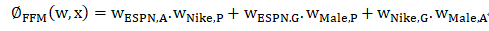 w_ESPN用于了解耐克(w_ESPN·w_Nike)和男性(w-ESPN·w-Male)的潜在影响。然而,由于Nike和Male属于不同的领域,(EPSN,Nike)和(EPSN,Male)的潜在影响可能不同。而对于FFM,每个特征都有几个潜在的向量。