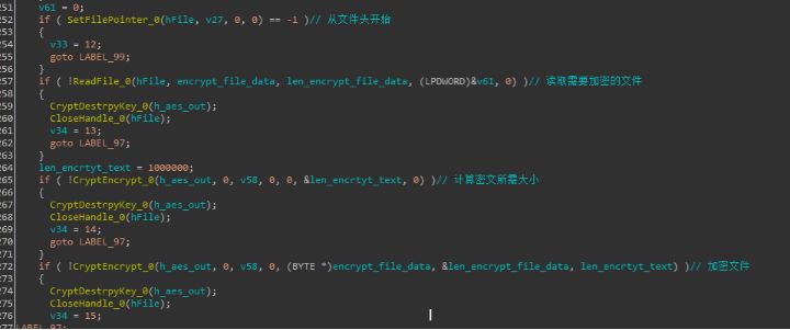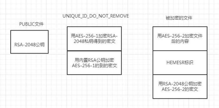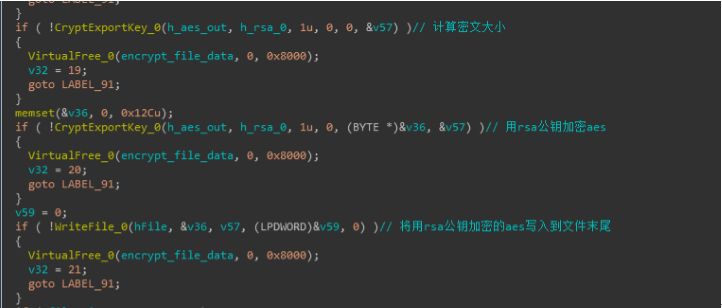 最后,病毒将AES密钥用PUBLIC中的RSA公钥加密,再将加密后的AES密钥写入到文件尾部。
