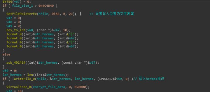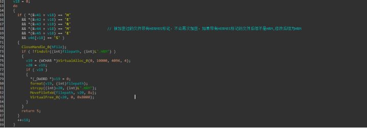 开始加密,病毒会读取该文件内容到内存中,再对内容进行检测——看文件内容中是否被写入了HERMES标记,该敲诈者的名字“爱马仕”就是取之于该标记。若找到标记则不再加密文件,仅将扩展名改为.HRM即可。