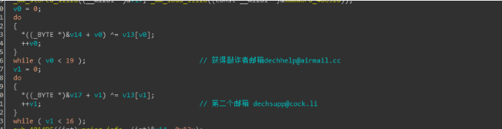 从自身资源中获取勒索邮箱地址。邮箱地址有两个:一个是dechhelp#airmail.cc,另一个是dechsupp#cock.lio。其中后者为备用邮箱。