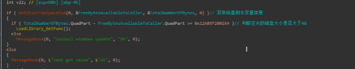 首先,勒索病毒会检测中招者磁盘的剩余量,如果获取磁盘剩余量失败或者是磁盘的容量不足4G,勒索病毒就会停止工作。