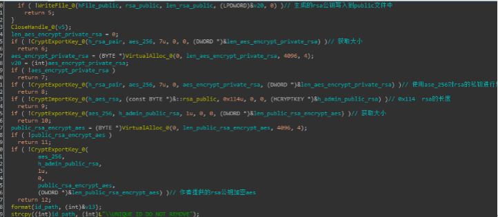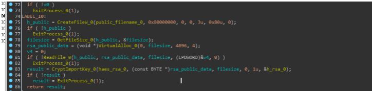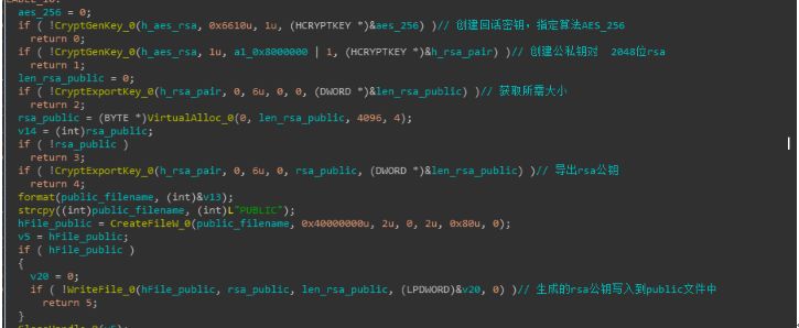 完成后,病毒会将刚刚生成的PUBLIC文件中的RSA公钥读取出来,在稍后进行的文件加密操作中,用于对加密密钥的再加密工作。