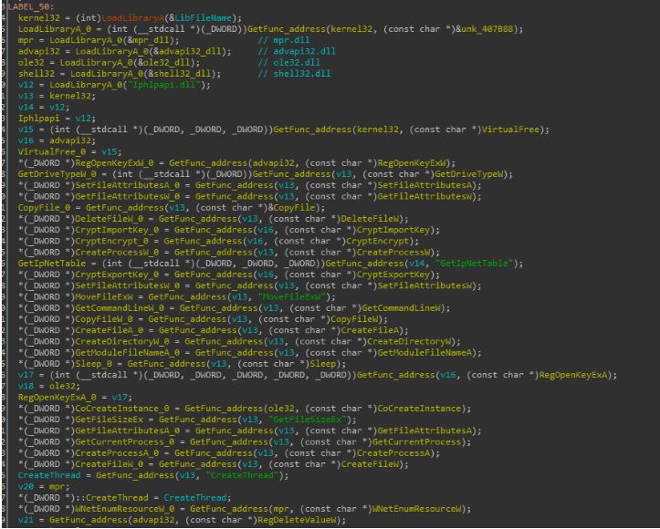 若磁盘空间充足,则会通过动态获取的方法加载后续操作所需要的函数,以此来躲避杀毒软件的静态查杀。下图仅列出一部分