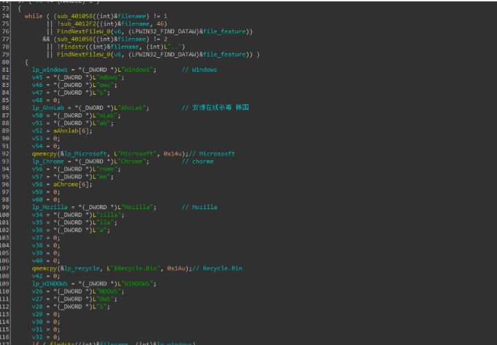 在遍历目录的时候,如果遇到目录包含Windows、AhnLab、Microsoft、Mozilla、$Recyle.Bin、WINDOWS等字符串中的任意一个,病毒便会跳过对该目录的加密。